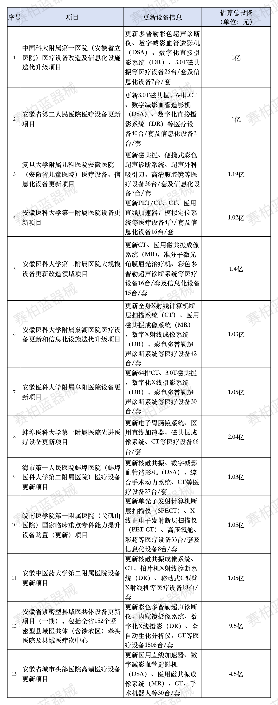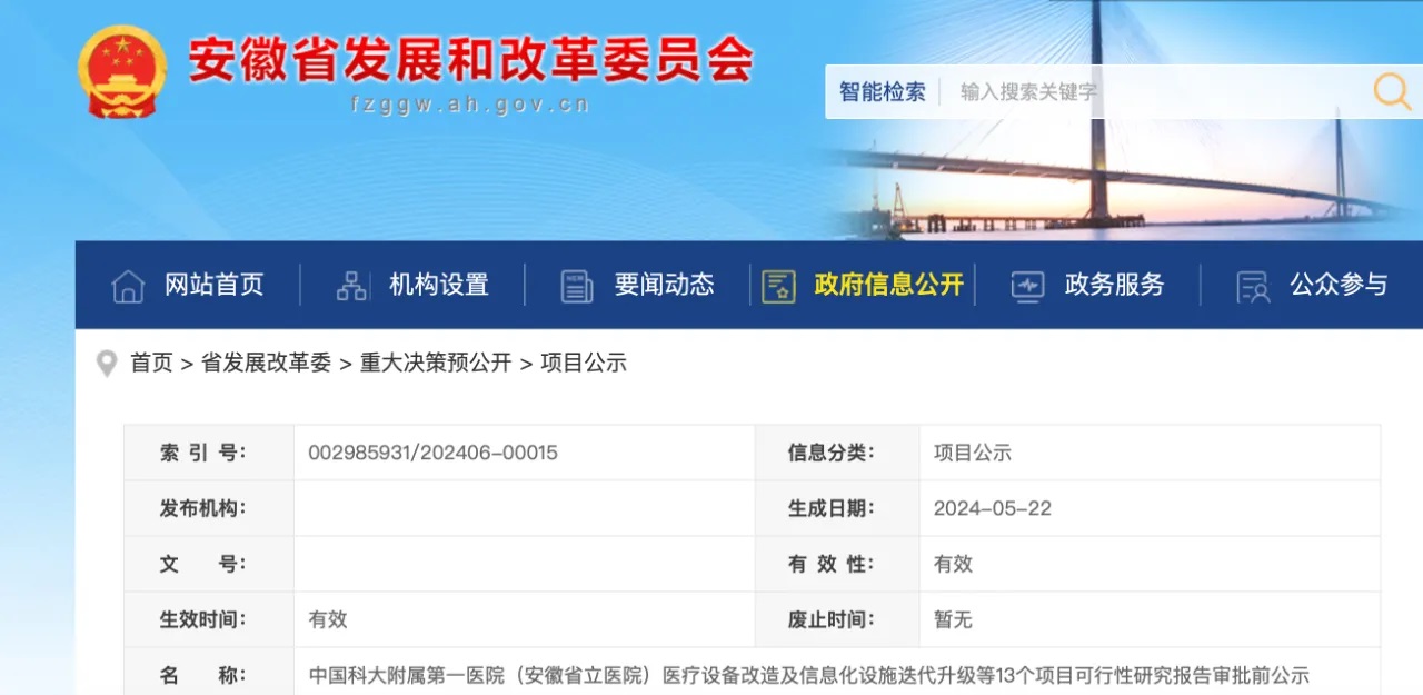 除廣東以外,安徽省發(fā)改委近期發(fā)布《中國科大附屬第一醫(yī)院(安徽省立醫(yī)院)醫(yī)療設(shè)備改造及信息化設(shè)施迭代升級等13個項目可行性研究報告審批前公示》,估算總投資約為26.86億元。