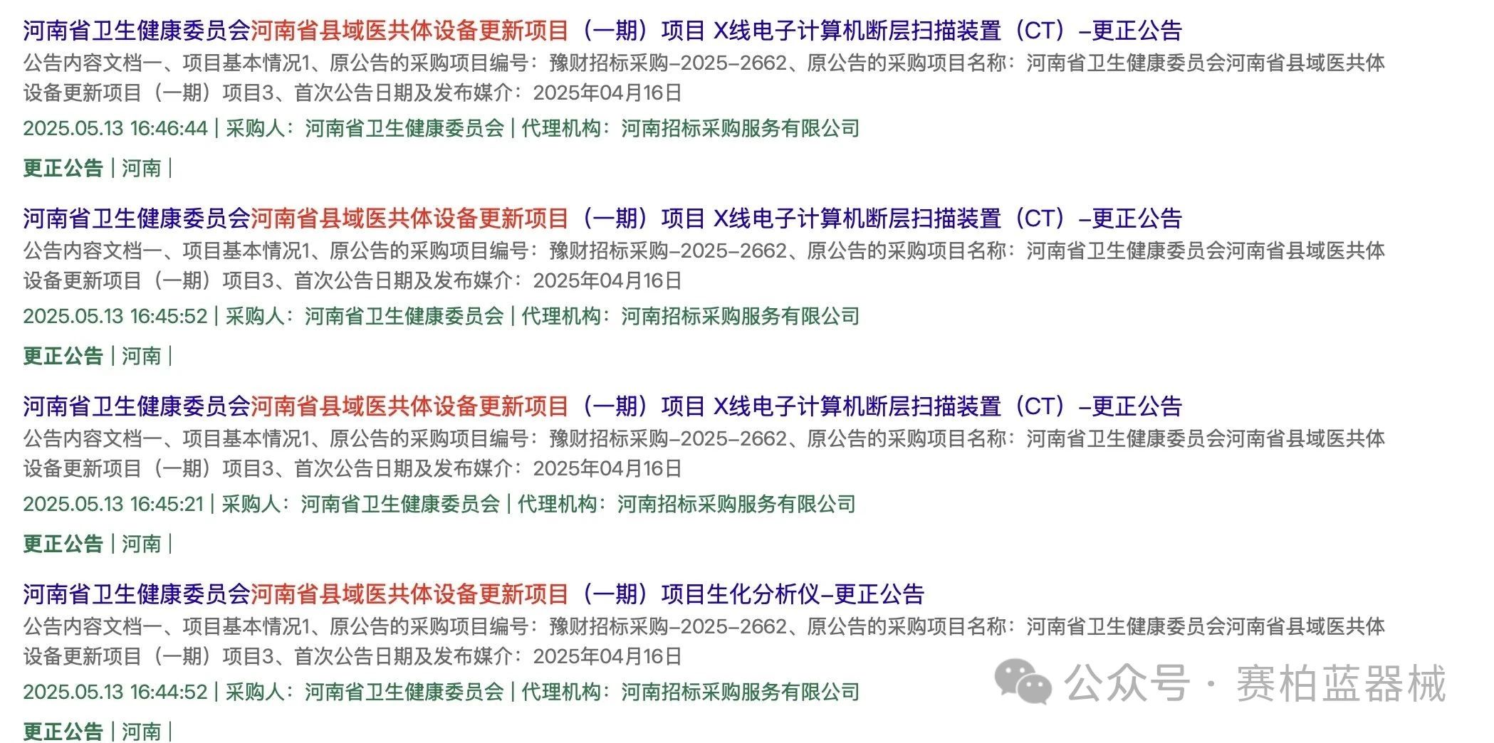 更正公告中提到,除開標時間變更外,招標文件其他內容不變。其中CT的開標時間由5月12日9時變為5月21日9時;生化分析儀的開標時間由5月12日9時變為5月20日9時。