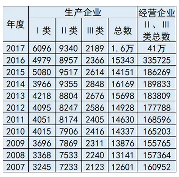 以下為2007~2017中國醫療器械生產經營企業數量變化情況: