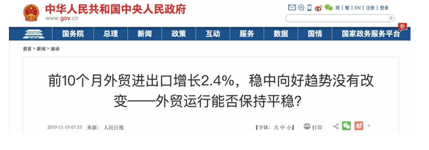 11月19日,國務(wù)院官網(wǎng)轉(zhuǎn)發(fā)了人民日報文章,文章指出,前10個月,我國實現(xiàn)外貿(mào)進(jìn)出口總值25.63萬億元,同比增長2.4%,其中出口13.99萬億元,增長4.9%。