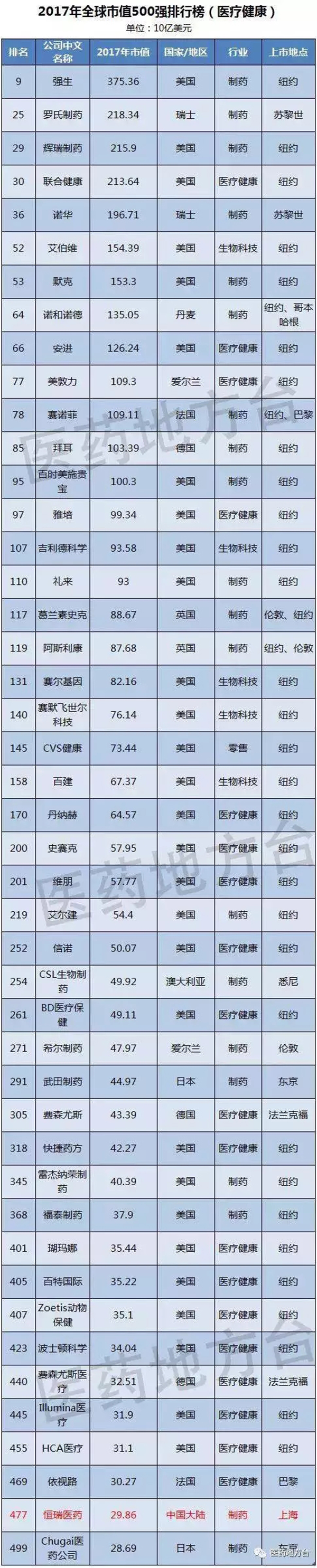 從具體行業(yè)來看,上榜“2017年全球市值500強”的醫(yī)療健康企業(yè)有45家,其中排名前三的是強生、羅氏制藥、輝瑞制藥。而中國僅有1家藥企上榜——恒瑞醫(yī)藥298.6億美元。