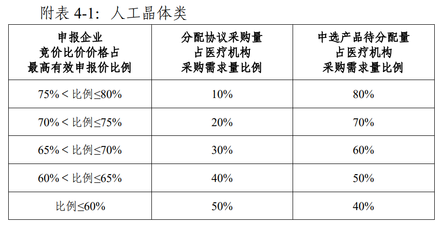 與脊柱國采類似,此次集采擬中選規(guī)則中的規(guī)則二,是行業(yè)俗稱的“躺平復(fù)活”機制。其中,人工晶體降40%、運動醫(yī)學(xué)降60%可獲得擬中選資格(具體折算規(guī)則、適用范圍見文件)。此外,第四批國采還增加了規(guī)則三:對于申報企業(yè)不超過2家的競價單元,人工晶體降20%、運動醫(yī)學(xué)降30%可獲得擬中選資格。