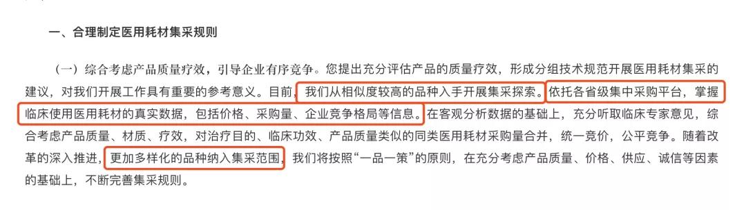 今日,在第1849號(醫療體育類100號)提案答復的函中,國家醫保局表示:將合理制定醫用耗材集采規則,綜合考慮產品質量療效,引導企業有序競爭。