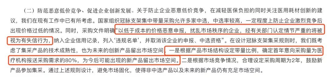 關于防止企業惡意低價競爭,在減輕醫保負擔的同時關注醫用耗材創新的建議,在現有工作中已有所考慮。國家組織冠脈支架集中帶量采購允許多家中選,中選率較高,一定程度上防止企業激烈競爭后出現價格過低的情況。同時,采購文件明確“以低于成本的價格惡意申報,擾亂市場秩序的企業,經有關部門認定情節嚴重的將被視為有失信行為,納入企業信用記錄,列入‘違規名單’,并取消該企業的申報、中選資格”。