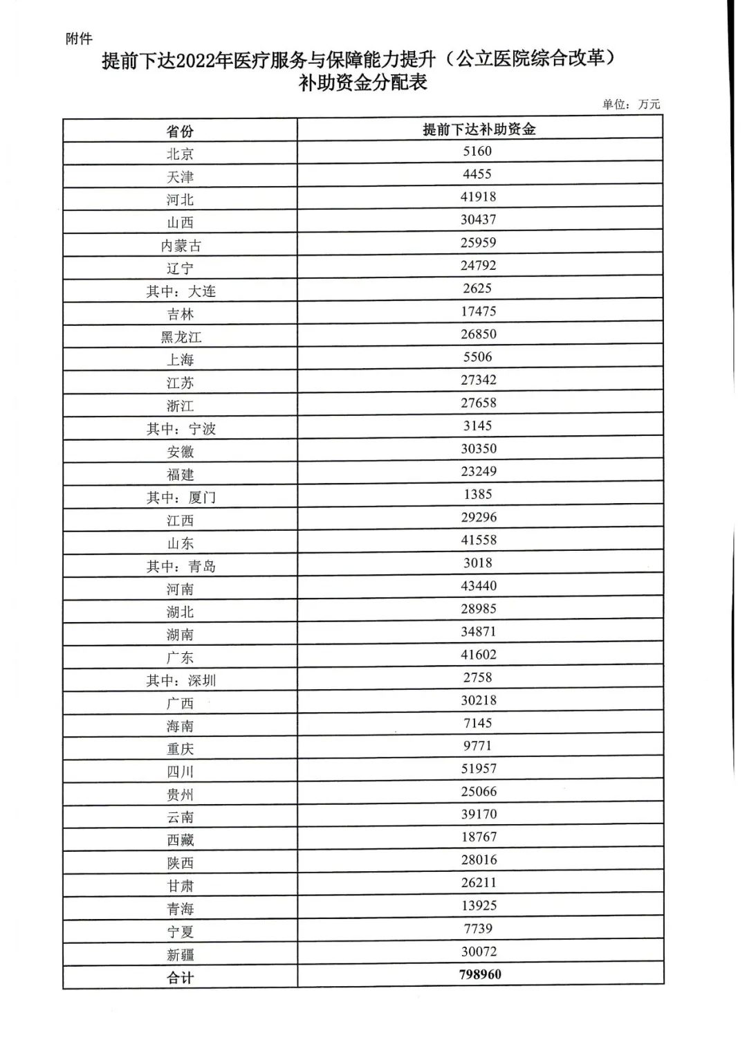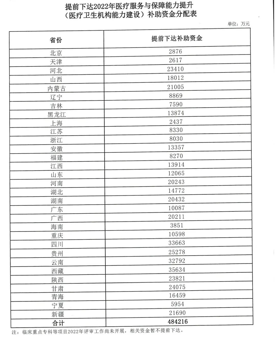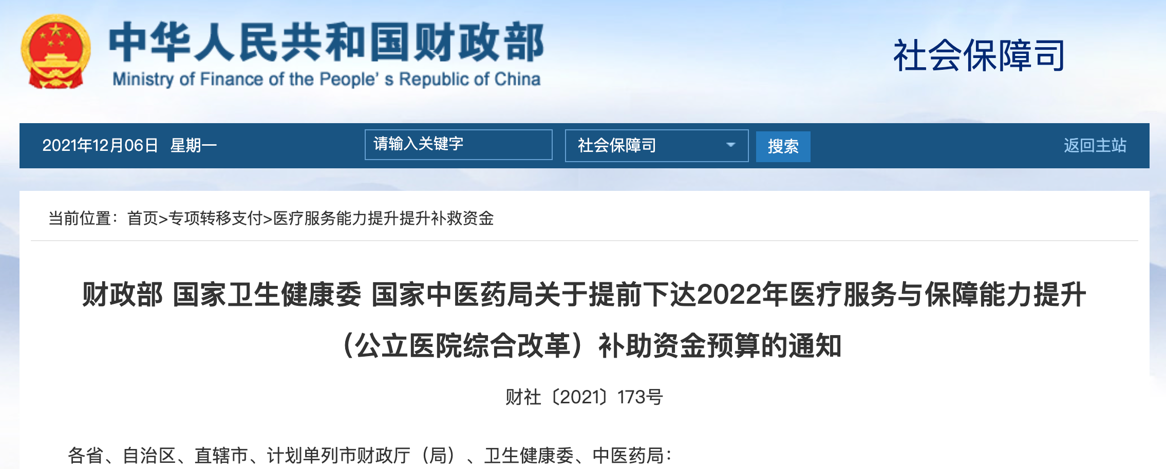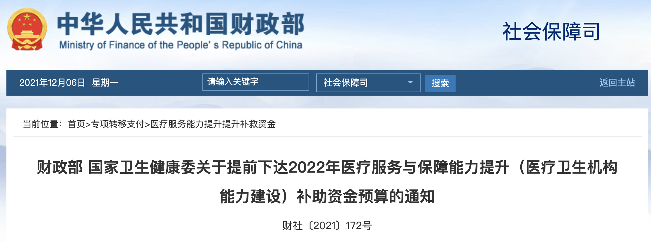 同一天,財政部、國家衛(wèi)生健康委發(fā)布《關(guān)于提前下達2022年醫(yī)療服務與保障能力提升(醫(yī)療衛(wèi)生機構(gòu)能力建設(shè))補助資金預算的通知》。