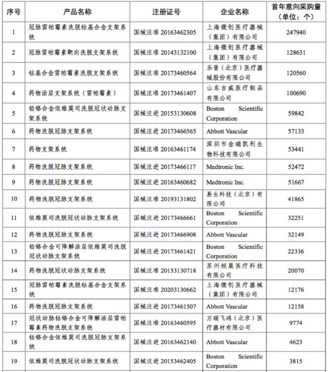 首年意向采購總量為1074722個,由聯盟地區各醫療機構報送采購總需求的80%累加得出。上海微創、樂普、波士頓科學、雅培、美敦力等12家企業赫然在列。