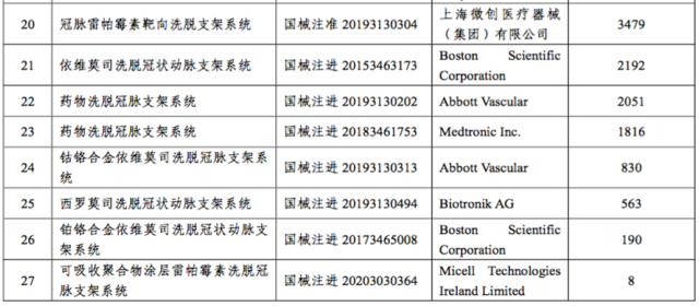 進口品牌:波士頓科學需求量約12萬個,共6個品種;雅培需求量約11萬個,共6個品種;美敦力需求量約11萬,共3個品種。