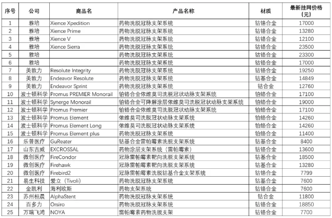 從文件中,我們可以了解此次國采冠脈支架涉及的材質為鈷鉻合金和鉑鉻合金,此前合金類冠脈支架產品最新掛網價格大致如下: