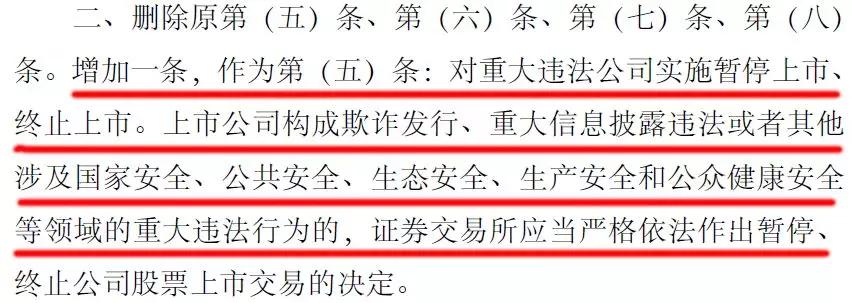 證監會對退市制度的修改,最重要的一條就是明確了,上市公司涉及到公共安全、生態安全、生產安全和公眾健康安全等領域的重大違法行為的,證券交易所應當嚴格依法作出暫停、終止公司股票上市交易決定。