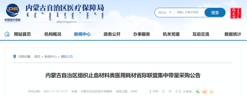 11月15日,內蒙古醫保局發布《內蒙古自治區組織止血材料類醫用耗材省際聯盟集中帶量采購公告》(附文末),將開展止血材料類醫用耗材省際聯盟集中帶量采購。