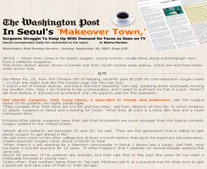 美國的權威日報WashingtonPost(WP)在30日的報道說期待變成像韓劇里出現的主人公一樣擁有大眼睛,高鼻子,小巧的臉型,打算接受整形手術的人們向首爾蜂擁而至。