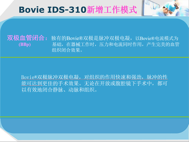 IDS智能數字化系統 Bovie IDS系列是當今現代手術領域中應用的全數字化的、創新科技的電外科儀器。它簡單易用,并且集中了大部分的電外科手術需要的功能。單極和雙極功能最大程度地滿足了醫生對高頻電刀既要安全,又要易用的要求。數字化技術使IDS系列產品在實際手術運用中非常簡單方便,可以讓醫生真正地把精力放在最重要的地方----手術本身和患者身上。